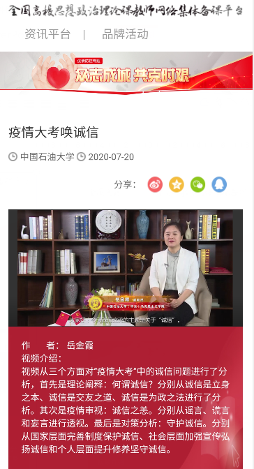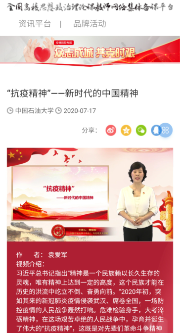 近日,bat365在线中国官网登录入口组织教师参加教育部社科司委托全国高校思想政治理论课教师网络集体备课平台向全国高校bat365在线中国官网登录入口发起的“思政课战疫小课堂”专项活动,365官网岳金霞主讲的《疫情大考唤诚信》和袁爱军主讲的《抗疫精神——新时代的中国精神》成功入选该平台。