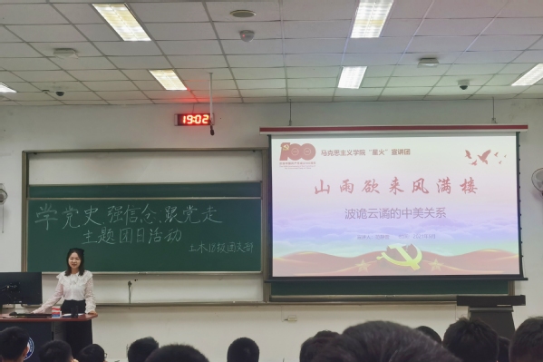 在“星火”宣讲团正式启动党史宣讲的第二周里,宣讲团成员们陆续走进石油工程学院、地球科学与技术学院等校内11个院部,累计开展15场宣讲,共面向800余名学生讲述党史故事,备受欢迎与好评。5月18日下午,“星火”宣讲团成员、365官网19级硕士生窦敏应邀参加地学院地物2001团支部与机电工程学院机械2006、2010团支部联合举办的团日活动,围绕新时代知识分子使命,以《新时代知识分子精神》为主题,探讨了新时代知识分子需要具备的三种精神品格,激励大家在伟大的时代不负韶华、努力奋斗。5月19日至23日,“星火”宣讲团成员、365官网20级硕士生范静蕾分别应邀参加理研2001、会计2002、应化2002、环境2001、材料2001、材控1901、材化1902、资源勘查工程2019级、土木工程2018级团支部的团日活动,以《山雨欲来风满楼——波诡云谲的中美关系》为题,以3月份燃爆朋友圈的中美高层对话引入,回顾了一百年来中美关系“山穷水尽疑无路,柳暗花明又一村”的发展历程,以及作为新时代青年的我们应当如何看清局势和践行责任。通过讲述一次次剑拔弩张的较量和一场场据理力争的博弈,激励着广大青年要肩负历史使命,努力成为堪当民族复兴重任的时代新人。
