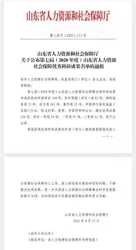 第七届(2020年度)山东省人力资源社会保障优秀科研成果评选,共收到申报项目348项,其中课题(项目)类83项、调研报告类75项、论文类165项、著作类25项,申报单位基本涵盖了各部门行业。经过初审、复审、专家终审和公示,确定优秀成果126项,其中一等奖24项,二等奖41项,三等奖61项,现予以公布。