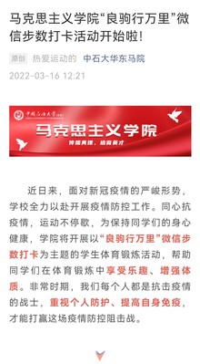 在全员封闭管理的情况下,为保证学生的身体健康,365官网研究生会积极筹办体育活动,开展了以“良驹行万里”微信步数打卡为主题的学生体育锻炼活动,帮助同学们在体育锻炼中享受乐趣,增强体质。