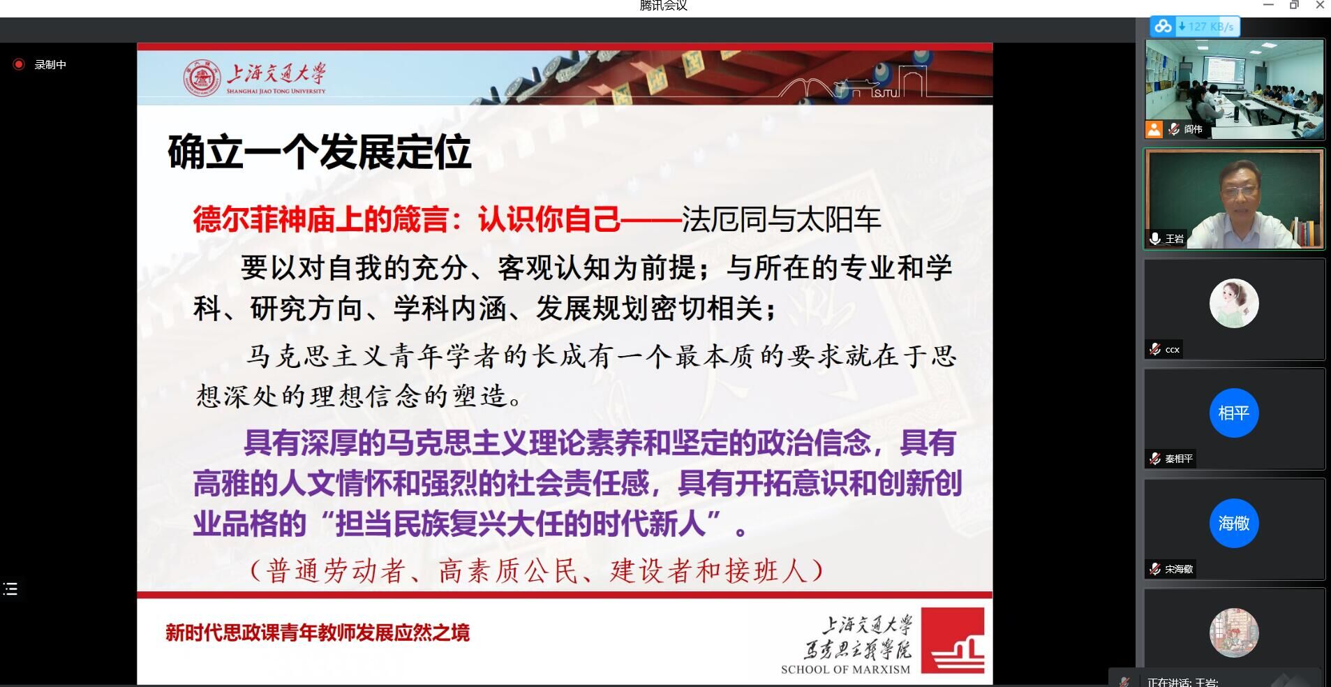 王教授以当代马克思主义理论学科发展的新趋势为背景,引出马克思主义青年导师和青年学者应把握好以下六个导向:第一,确立一个发展定位,王教授从苏格拉底名言“认识你自己”出发,启迪师生们以自我客观认知为前提,在自爱自立自强基础上赢得自信。第二,树立两种风气:一是教风,为师者应将“爱智”“师范”和“育人”完美结合,追求大智慧,做好新时代的“四有”教师;二是学风,为学者应将“好学”“质疑”和“创新”完美结合,实现四个“转变”。第三,树立三种意识,王教授分别介绍了如何培养危机意识、进取意识、宽容意识,强调要以“真学、真懂、真信、真用”规避“春天”的迷茫。第四,提倡四种资源,王教授指出学科研究要善用学缘资源、学术圈资源、高校资源和社会资源,把握学术研究的两个向度,瞄准社会前沿。第五,养成五种科研品性,即前沿的把握、习惯的养成、课题的培育、团队的意识和诚信的坚守。对此,王教授分享了课题申报书撰写的经验与技巧,列举了当前我国意识形态热点和前沿问题。第六,处理好六种教学关系:教学内容的思想性与教学方法的艺术性;理论知识系统性、实践素材生动性与网络课堂多样性;知识结构的合理性与学有专攻的特殊性;教材体系的原则性与课堂把握的灵活性;教学手段的先进性与具体内容的特殊性;教学方法的散在性与教学理念的统一性。