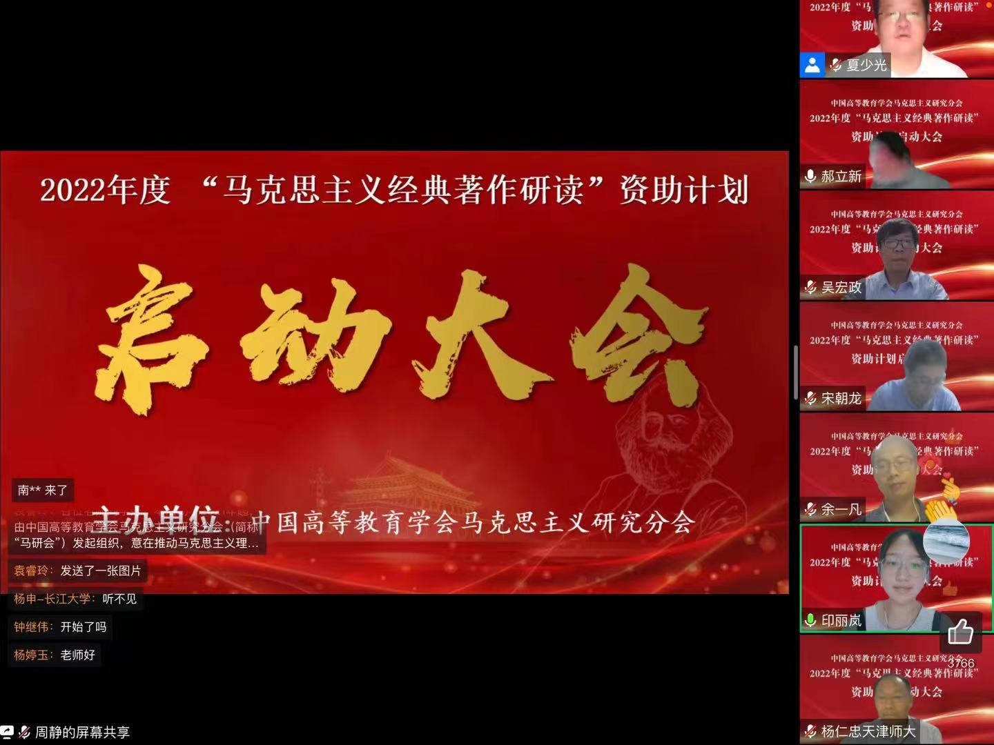 2022年7月15日19点,中国高等教育学会马克思主义研究分会(以下简称“马研会”)2022年度读书小组资助计划启动大会在线上举行。“马克思主义经典著作研读”资助计划是由马研会发起组织,旨在推动马克思主义理论学科人才培养,在青年学子中大力营造研读经典著作风气的学习和实践活动,自2021年开办以来,为马克思主义理论学科人才培养做出了突出贡献。