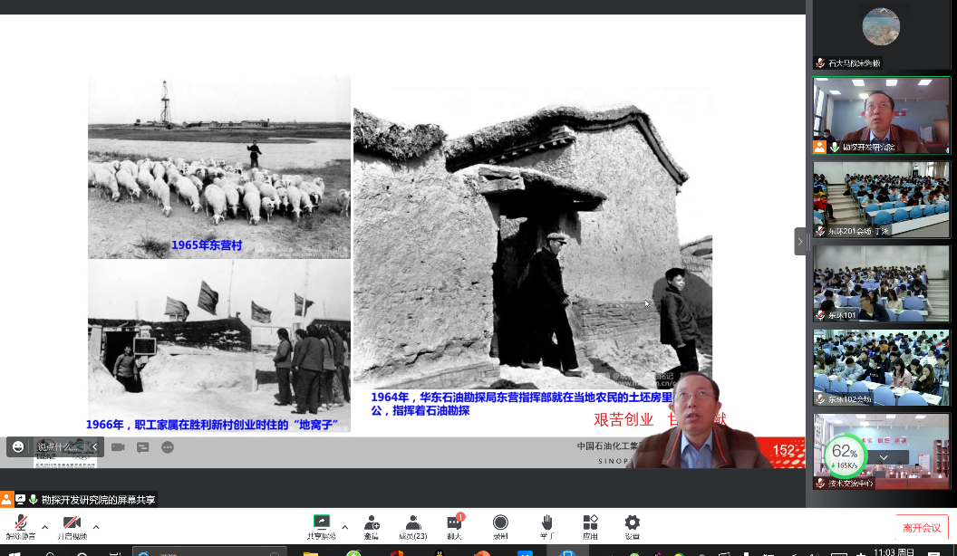 习近平总书记指出:“‘大思政课’我们要善用之,一定要跟现实结合起来。”2022年10月9日上午,胜利油田油气勘探高级专家王学军教授作为线上主讲嘉宾,连线365官网“中国近现代史纲要”和“思想道德与法治”实体课堂,以“胜利油田勘探开发历程与进展”为题,为学生带来了一场“油味儿”十足的“大思政课”。来自地学院和石工学院“双一流”专业的近800名学生分别在东环101、102、201、203四个教室同上一堂课,共享云端思想盛宴。