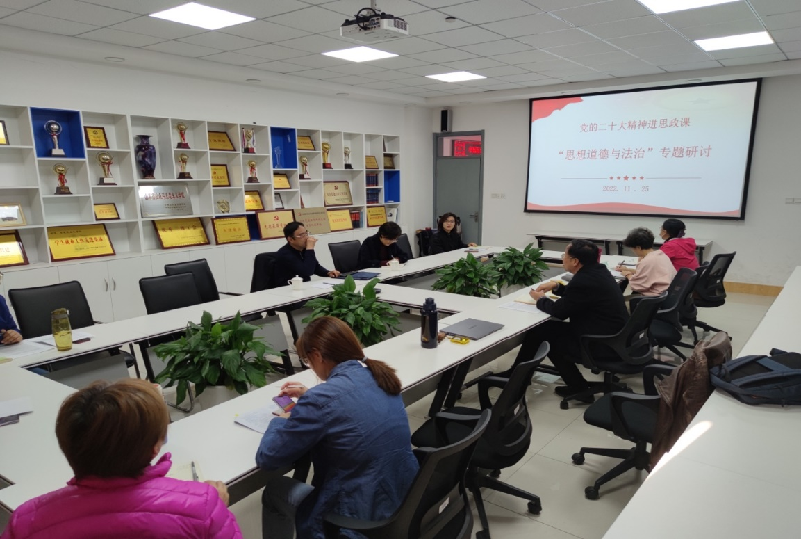 学校党委副书记、纪委书记吴强明对深入学习党的二十大精神并有效融入思政课发表了意见。他强调对党的二十大报告要多读、深读,要全面领会其精神实质和科学内涵,并对党的二十大精神融入《思想道德与法治》课堂教学提供了自己的思路。