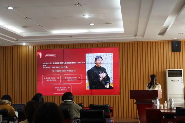 为学习党的二十大代表张桂梅同志事迹精神,倡导女性自尊自信自立自强,3月7日上午,学院在文理楼457报告厅举行“巾帼心向党,芳华永担当——学习党的二十大女代表先进事迹”主题活动。本次活动由研22-1班长姜缘主持,22级全体硕士研究生女同学参加。