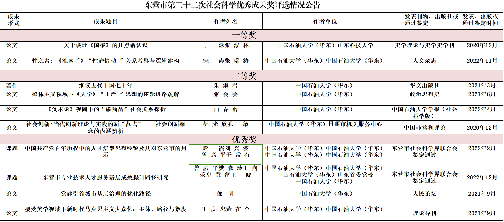 本次评奖工作首次委托省外第三方智库进行,经过科学严谨的评审,共有240项成果获得东营市第三十二次社会科学优秀成果奖,其中:一等奖20项、二等奖40项、三等奖80项、优秀奖100项。bat365在线中国官网登录入口(华东)共有20余项作品获奖。