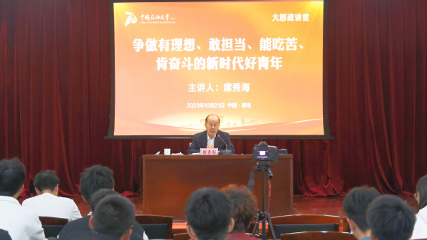 席秀海的讲授娓娓道来、风趣幽默,既源自丰富的石油行业工作实践,也蕴含着精辟睿智的人生哲理,十分引人入胜。在交流互动环节,同学们纷纷提出自己感兴趣的问题。针对同学们提出的“如何安排自己有限的精力”“如何看待现代人信仰缺失”“如何看待走旁门左道却能成功的人”等问题,席秀海循循善诱,利用一个个鲜活的事例和通俗易懂的话语,教导同学们要抓住重点、坚定信念,将个人与国家的命运紧密结合起来,树立正确的榜样观,以优秀的人才为榜样,做最好的自己。
